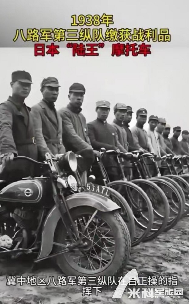 1938年的河北,我们八路军战士缴获了一批日军车辆,其中就有一辆日本“陆王”摩托车(下图最左侧)。